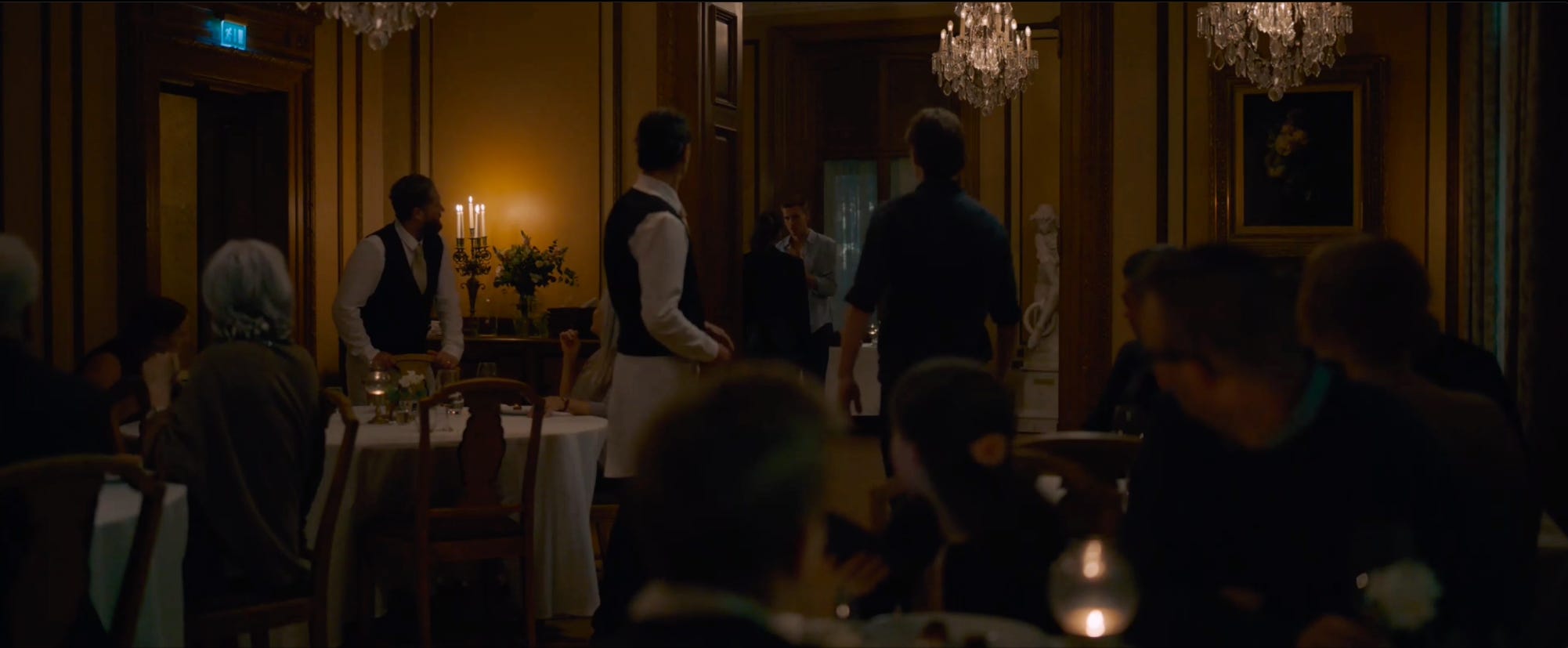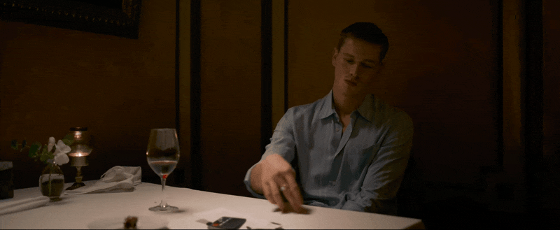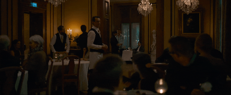 A. A slightly generic location — a fancy, a bit stuffy, but really nondescript restaurant playing some faint, generic classical music. Just enough to still be believable, but allow for our minds to replace it with any other fancy place we’ve been to.