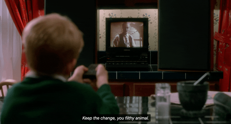 “Keep the change, you filthy animal,” continues the gangster on the TV screen, much to Kevin’s delight. Disappointed by the lack of a tip, and mumbling, “Cheapskate,” the boy is on the way out when he finally realizes who he’s been talking to.